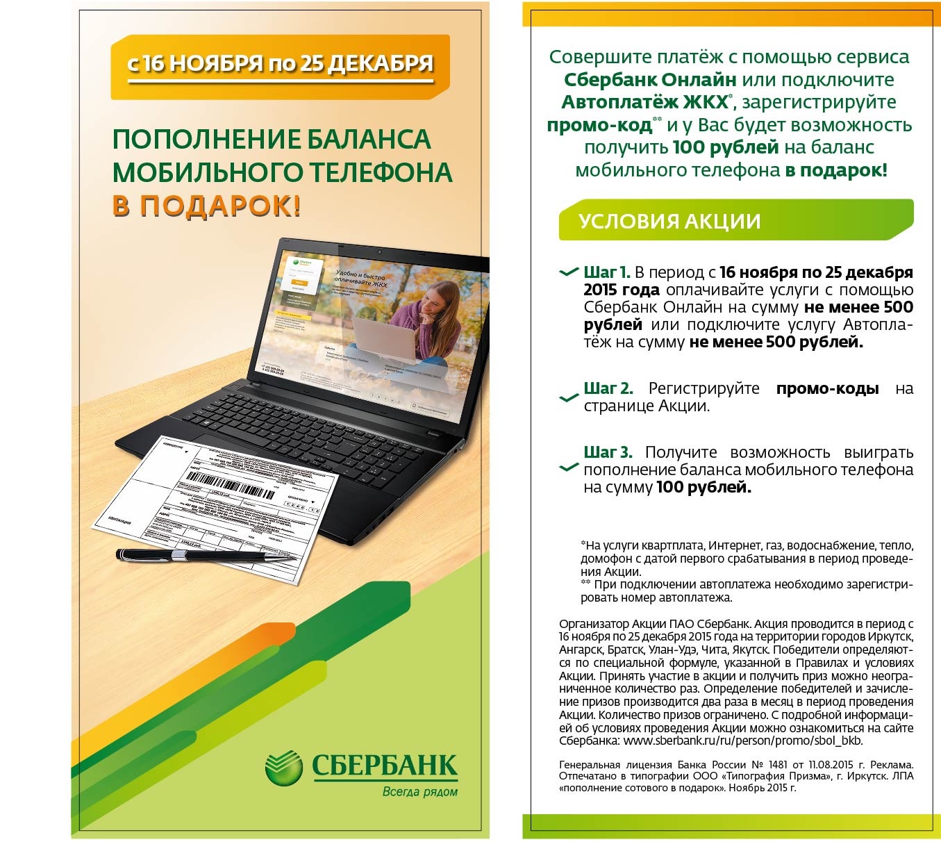 Сбербанк России проводит акцию: совершите платеж с помощью сервиса Сбербанк Онлайн или подключите Автоплатеж ЖКХ на сумму не менее 500 руб, зарегистрируйте промо-код (появляется на экране после проведения платежа) и получите возможность выйграть пополнение баланса мобильного телефона на сумму 100 рублей.