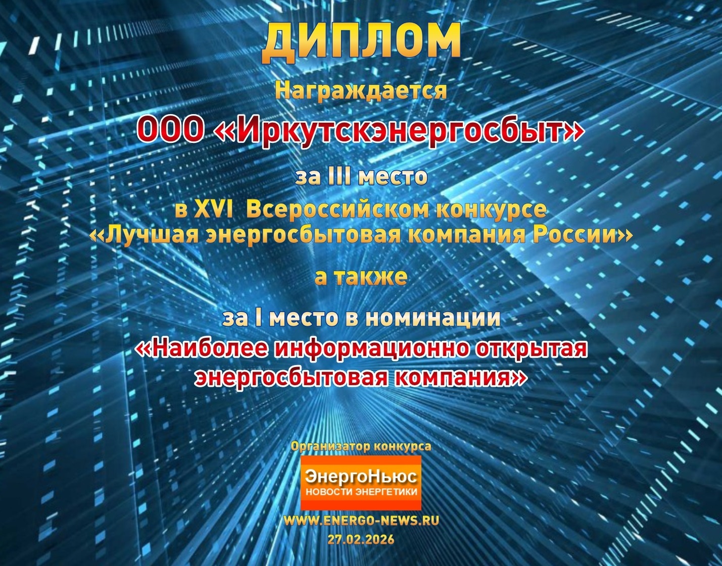 «Иркутская энергосбытовая компания» одержала победу в номинации «Наиболее информационно открытая компания» и заняла третье место в общем зачёте на ХVI Всероссийском конкурсе «Лучшая энергосбытовая компания России».