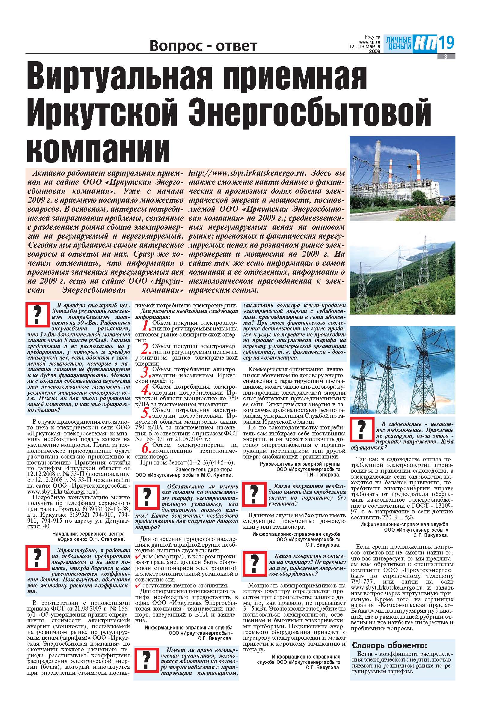12.03.2009 Виртуальная приемная ООО "Иркутскэнергосбыт", газета "Комсомольская правда"