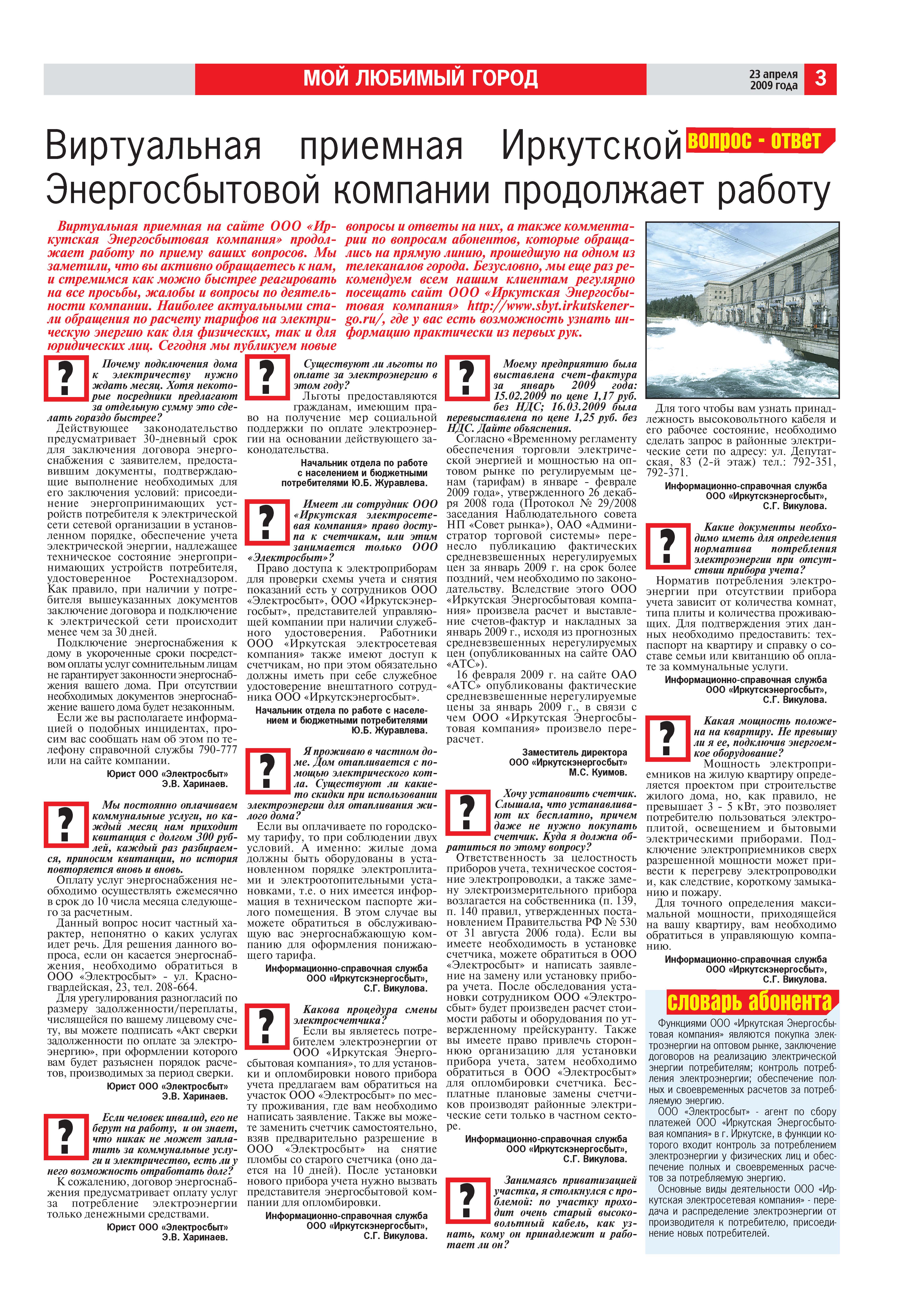 23.04.2009 Виртуальная приемная ООО "Иркутскэнергосбыт", газета "Комсомольская правда"