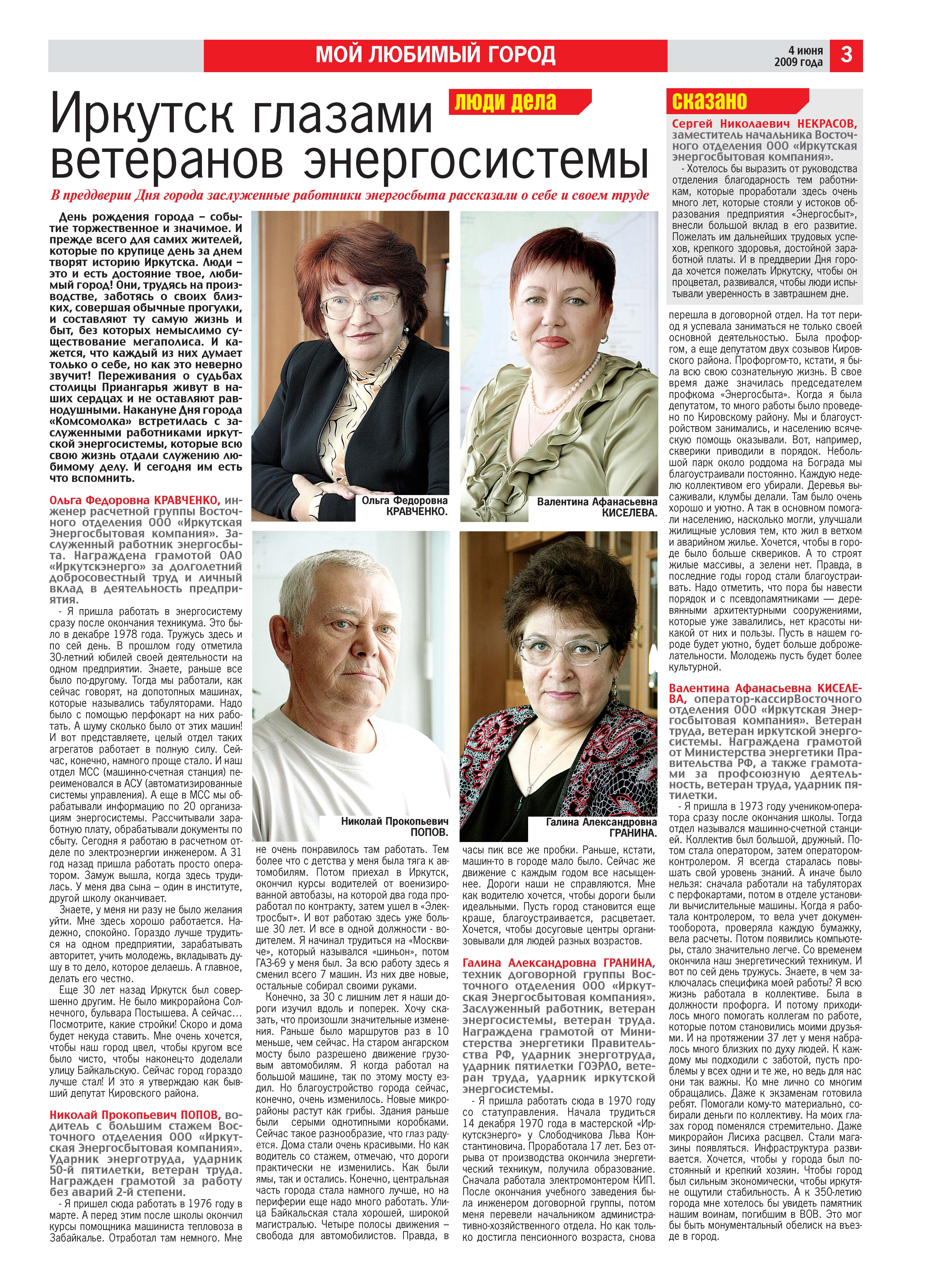 04.06.2009 Иркутск глазами ветеранов энергосистемы, газета "Комсомольская правда"