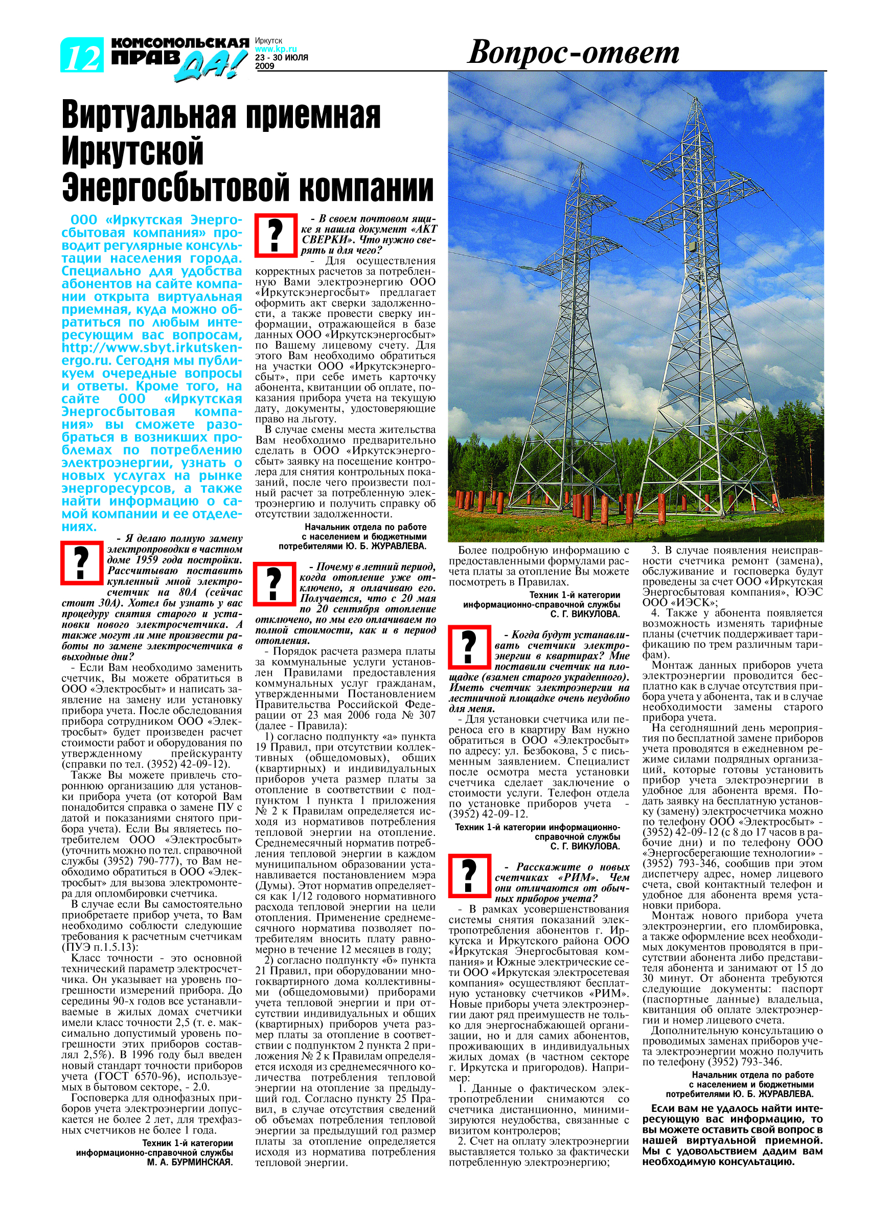 23.07.2009 Виртуальная приемная ООО "Иркутскэнергосбыт", газета "Комсомольская правда"