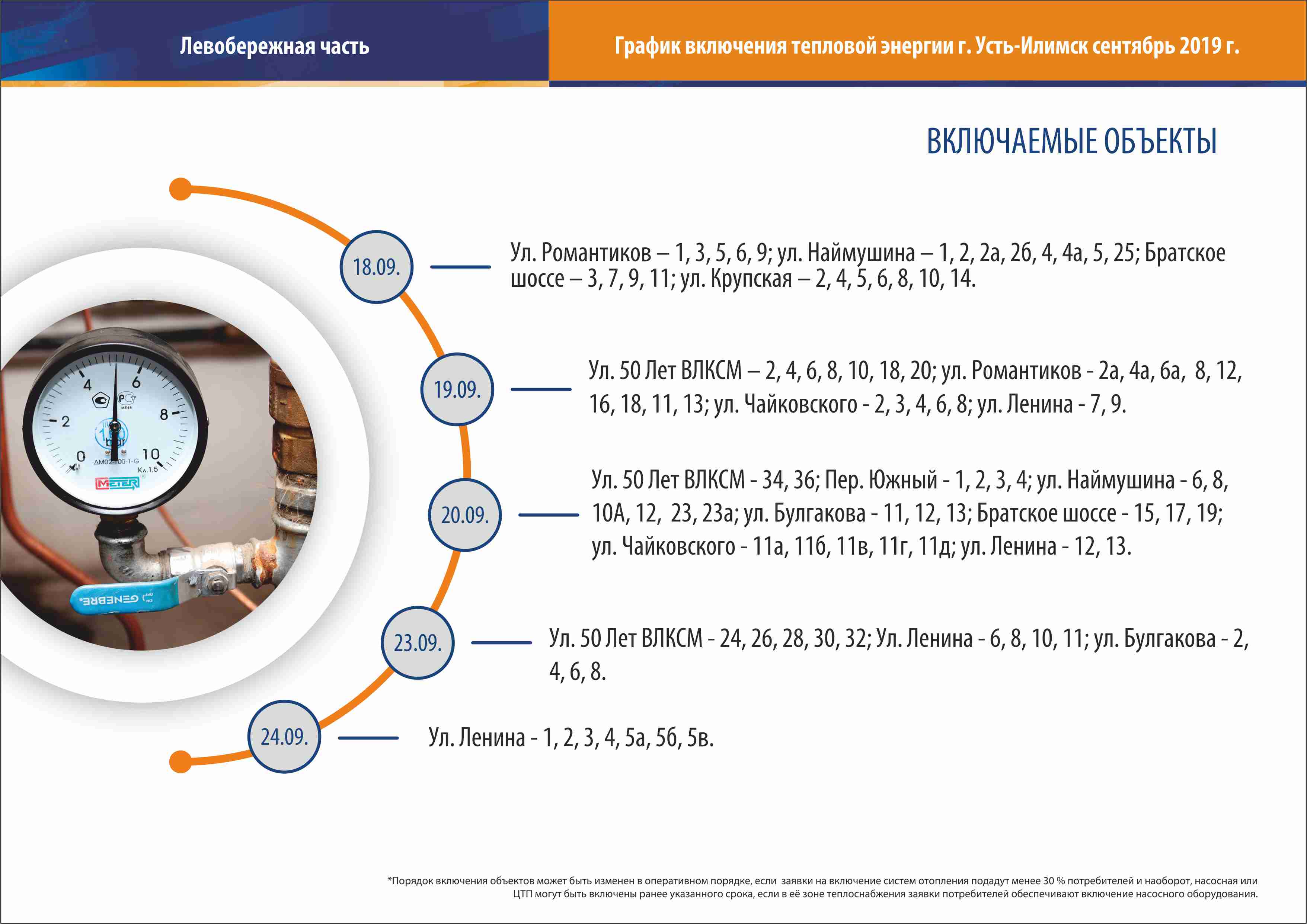 В Усть-Илимске начался отопительный сезон. В инфографике представлена по районам готовность тепловых сетей к подаче тепла в дома города, первый день – это 18 сентября.