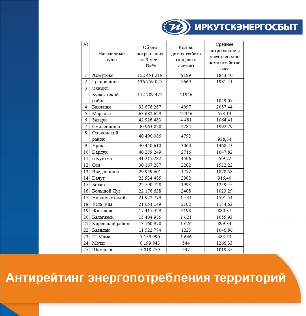 На первом месте с наибольшим объемом энергопотребления находится поселок Хомутово, потребивший более 152 млн кВт*ч. Такого объема электроэнергии хватило бы, чтобы целый год обеспечивать электричеством примерно 1500 многоквартирных домов. А поселку Хомутово, где таких домов почти нет, хватило этого объема энергии на 9 месяцев. Каждый потребитель здесь в среднем использует 1843 кВт*ч в месяц! Для сравнения, например, в Ангарске эта цифра в 8 раз меньше – 216 кВт*ч.